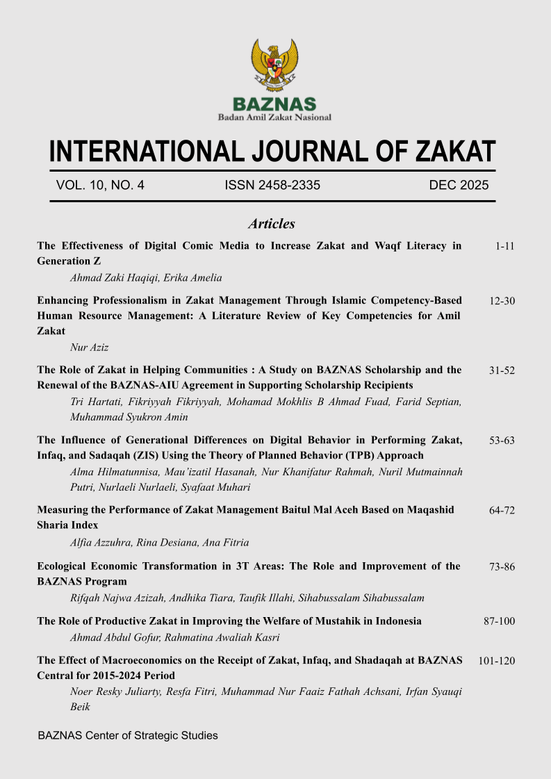 The International Journal of Zakat (IJAZ) is an open-access journal. All accepted manuscripts are published free of charge. The International Journal of Zakat (IJAZ) focuses on zakat studies such as general activities of zakat management, institutional foundation, zakat administers qualifications, good governance practices, assessment methodology, and other areas related to zakat. General activities of zakat management cover discourses about zakatable wealth, methods of collection, and performance indicators; institutional foundation includes the private sector, special departments, and government on a mandatory basis enforced by the regulation and credibility of the institutions; zakat administers qualifications that comprise sharia and professionalism principles and the trust of zakat payers; on the other hand, good governance practices cover internal and external reporting systems and risk management.